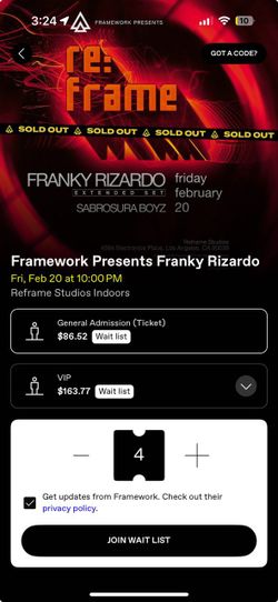 Framework Franky Rizaldo Tickets $149Marina Del Rey, CA