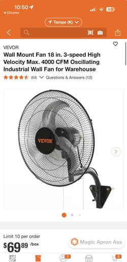VEVOR Wall Mount Fan 18in. 3-speed 4000 CFM Oscillating Industrial Wall Fan New $39$39Phoenix, AZ