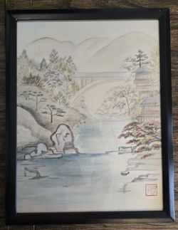 Japanese Watercolor On Silk Art In Frame - Bridge Landscape$8San Marcos, CA