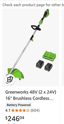 Greenworks 48V (2 x 24V) 16" Brushless Cordless (Attachment Capable) String Trimmer, (2) 4.0Ah Batteries and Dual Port Rapid Charger Included$220Norwalk, CA