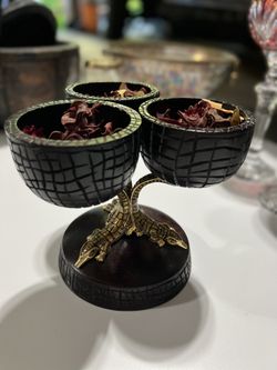 One of a kind Hand carved wood stand home decor with gold alegators leg stand. Decor perfect for popouri, candy, etc.$30Prairie View, IL