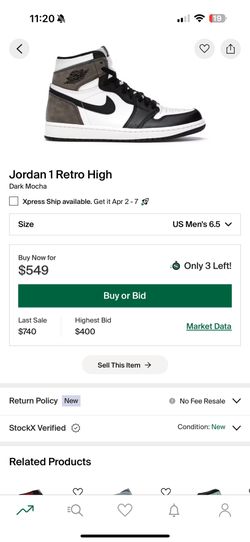 Jordan One Mocha Men’s 6.5$450Santa Clara, CA