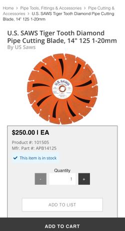 U.S. SAWS Tiger Tooth Diamond Pipe Cutting Blade, 14" 125 1-20mm$100Fontana, CA