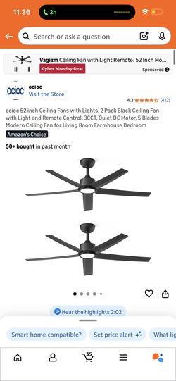 ocioc 52 inch Ceiling Fans with Lights, 2 Pack Black Ceiling Fan with Light and Remote Control, 3CCT, Quiet DC Motor, 5 Blades Modern Ceiling Fan for $130Marion, TX