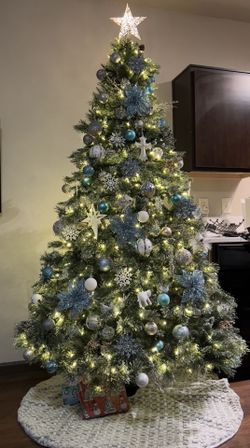 7.5ft Fully Decorated Christmas Tree – Blue, Silver & White Winter Theme (Lights Included!) $1,000Schaumburg, IL