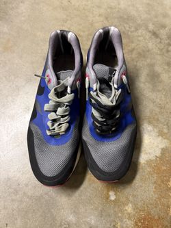 A pair of Nike Air Max 1 London QS Home Turf sneakers in the old royal, black, and grey colorway from the 2013 collection Size 9.5$45Lakewood, WA