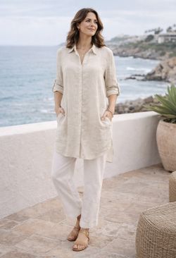 Tahari 100% Linen Beige Button-Down Tunic Shirt Women’s M length 31” armpit to armpit 20*2”$18New Castle, DE