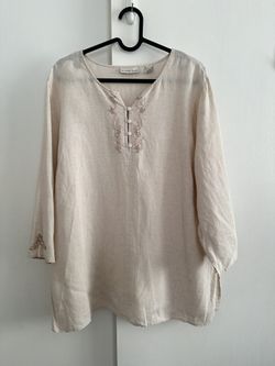 Amanda Smith beige linen tunic top three-quarter sleeves embroidered Sz XL Length 28” Armpit To Armpit 22*$28New Castle, DE