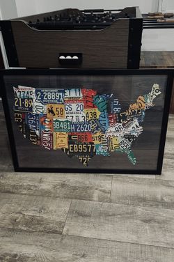 Framed License Plates print of United States art (38” x 26”) from ZGallerie. With hanging wire, In Excellent Condition. $75Yorba Linda, CA