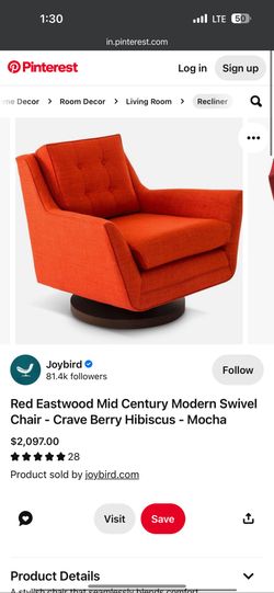 Free Delivery - Joybird Eastwood Mid Century Modern Swivel Chair$999San Jose, CA