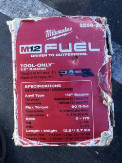 Milwaukeew M12 Fuel 1/2” Ratchet TOOL ONLY NEW$129Cypress, CA