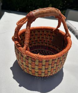 Beautiful handmade Allafia woven basket with leather straps/ handmade by a villager in Ghana/ in good condition/ has some vintage wear 9”$15Calabasas, CA