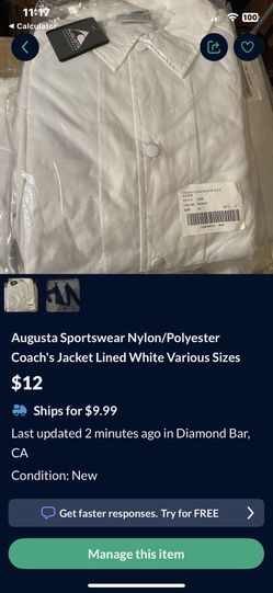 Augusta Sportswear Nylon/Polyester Coach's Jacket Lined White Medium$36Pomona, CA