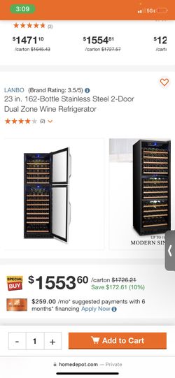 LANBO (Brand Rating: 3.5/5) © 23 in. 162-Bottle Stainless Steel 2-Door Dual Zone Wine Refrigerator$700Bakersfield, CA