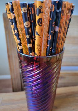 Grande 9" 16/20oz Halloween Kid Cup Classroom Gift Straw Set Starbucks Glass Look Swirly Orange Straw Pumpkin Candy Print Spooky Trick Or Treat Set $11Oak Glen, CA