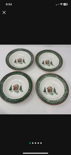 4 Qty Tre Chi Green Bowl sponge plate cabin Aspen Christmas tree Tre Ci salad cereal 8 1/2”$20Garden Grove, CA