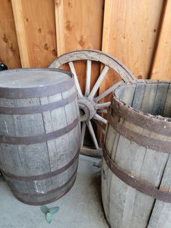 Antique Wagon Wheel, Barn Wood, 2 Barrels, 3 Barn Window, Milk Jug$500Hillsboro, OR