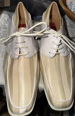 Preowned men’s size 12 Expressions by Roberto Chillini Men's Striped Satin Tuxedo Shoes white -Silver Tip in good condition. Located off lake mead and$15North Las Vegas, NV