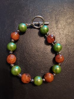 Handmade Green Pearl & Orange Small Hematite Bead Toggle Clasp Bracelet #8$7Palmdale, CA
