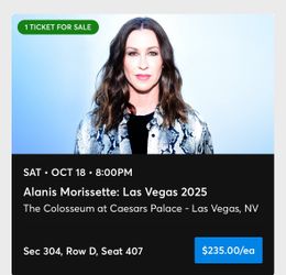 Alanis Morissette Ticket For Tonight In Vegas $200Las Vegas, NV