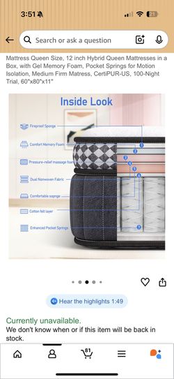 12’’ Queen mattress+box spring+rails$300Silverado, CA