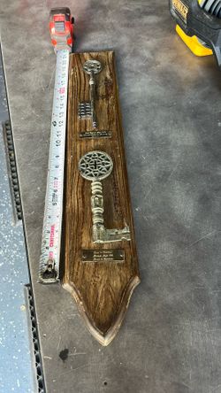 This is a vintage Spanish Revival key plaque featuring two decorative keys on a wooden board. $75Lancaster, CA