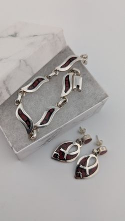 Taxco 925 Sterling Silver Red Coral & Black Onyx Inlay Set – Bracelet + Earrings$149Oak Park, IL