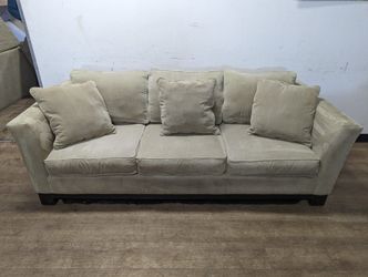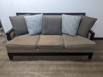 Tan Fabric Couch With Wood Trim & Throw Pillows$360Denver, CO