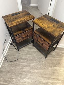 Set of 2 Rustic Wood & Metal End Tables w/ Charging Ports Pair of matching end tables, perfect for bedroom or living room.$50Roswell, GA