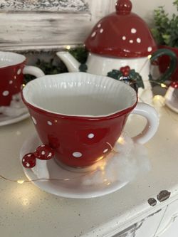 WORLD MARKET Winter Mushroom Ceramic Tea Pot, (4) Mug/Saucers & Dessert Dish-BRAND NEW VALUED @ $100$80Toms River, NJ