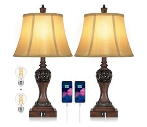 Set of 2 Touch Control 3-Way Dimmable Table Lamps with 2 USB Charging Ports Traditional Bedside Lamps with Bell Shape Faux Silk Shade & Brown Base $60Houston, TX