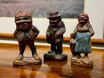 1940's Vintage Syroco Wood Repwood 4.5" Figurines, Set Of Three! Including Old Man & Woman With Umbrellas & Pirate Figures! Price For All 3!