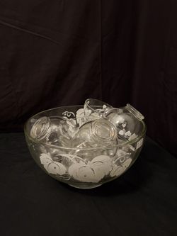 Vintage Anchor Hocking Punch Bowl With 12 Glasses Gold Trim Grape Leaf Etching$50Sanger, CA