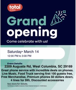Total Wireless phone store Grand opening Come celebrate with us! Saturday• March 14 12:00 PM to 3:00 PM Event Details: 2209 Augusta Rd, West Columbia$1Lexington, SC