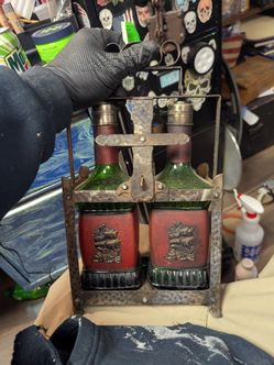 Antique double wine decanter set with hammered metal carrier$100Columbus, OH