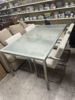 MODERN CONTEMPORARY DINING ROOM TABLE GLASS CHROME WHITE LEATHER 4 CHAIRS SET LIKE NEW CLEAN GLASS TOP$299Los Angeles, CA