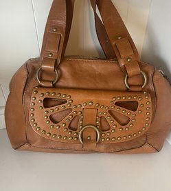 Beautiful caramel brown leather purse with gold-tone hardware and stud details 🤎$40San Jose, CA