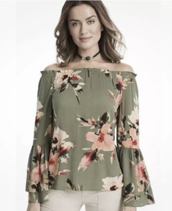 NEW WHBM Arya off shoulder military green peach floral bell sleeve blouse sz L.$17Katy, TX