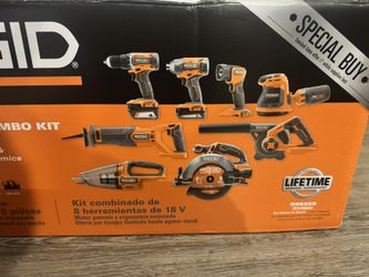 Brand New Unopened RIDGID18V Cordless 8-Tool Combo Kit with 2.0 Ah Battery, 4.0 Ah Battery, Charger, and Tool Bag$475Delaware, OH