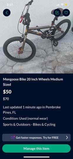 Mongoose Bike 20inch Wheels Medium Sized$50Pembroke Pines, FL