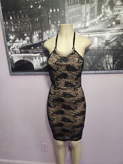 Size Medium Halter Open Back Mini Dress Black Lace Khaki Beige Inside Layer Tie On Halter Neck Stretchy$5Lawndale, CA