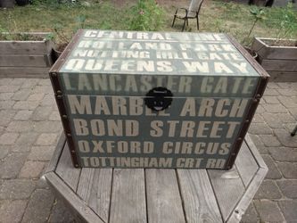 Vintage Metal and Canvas Lined Trunk with Bronze Accents, Leather Trim, and Brass Buttons $70Hawthorne, NJ