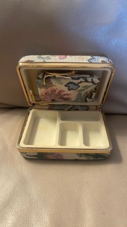 The item shown is a Mundi jewel case, specifically a vintage, hard-shell travel jewelry box with a floral tapestry or fabric cover.$20Houston, TX