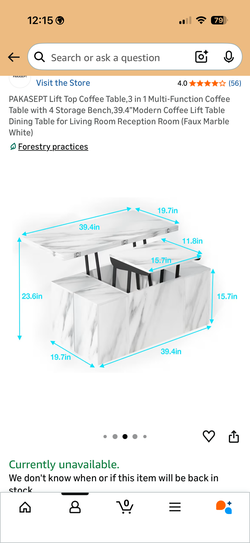Modern Lift-Top Coffee Table with Hidden Storage – Faux Marble Finish – 3-in-1 Multi-Function Table (39.4”)$65Charlotte, NC