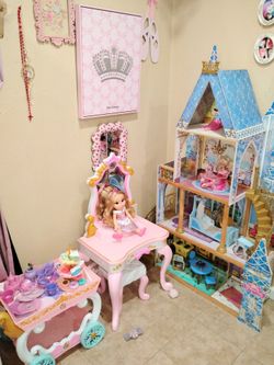 Disney princess tall castle with original furniture, vanity, Sleeping beauty doll, tea cart & pastries all Disney princess 👑 and all in great conditi$60San Bernardino, CA