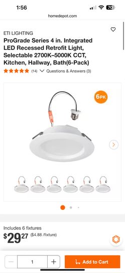 ETI LIGHTING ProGrade Series 4 in. Integrated LED Recessed Retrofit Light, Selectable 2700K–5000K CCT, Kitchen, Hallway, Bath(6-Pack)$18Lakeside, CA