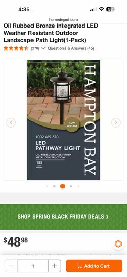 Hampton Bay Birmingham 155 Lumen Low Voltage Oil Rubbed Bronze Integrated LED Weather Resistant Outdoor Landscape Path Light(1-Pack)$25El Cajon, CA