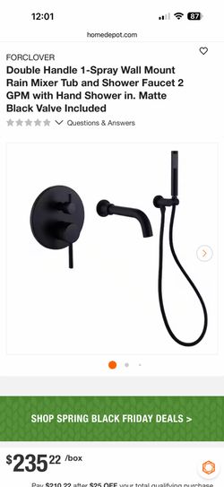FORCLOVER Double Handle 1-Spray Wall Mount Rain Mixer Tub and Shower Faucet 2 GPM with Hand Shower in. Matte Black Valve Included$110El Cajon, CA