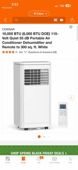 COWSAR 10,000 BTU (6,000 BTU DOE) 115-Volt Quiet 55 dB Portable Air Conditioner Dehumidifier and Remote to 300 sq. ft. White$149El Cajon, CA