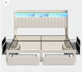 SoldQueen Size Bed Frame with 6 Storage Drawers, 2-Tier Storage Headboard with Led and charge ,Vertical Tufted Headboard, Platform Bed Frame with Wooden S$200Arcadia, CA